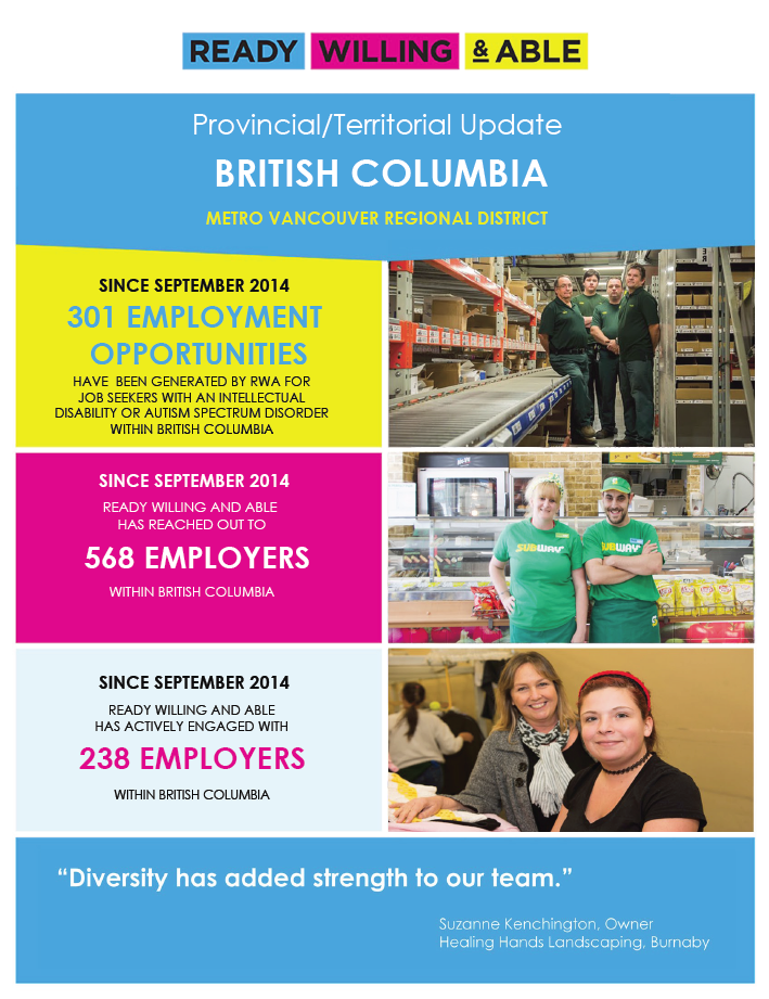 Ready, Willing & Able is a national initiative that engages, educates and supports employers to hire people with intellectual disabilities and autism spectrum disorder. Inclusion BC is an RWA partner, delivering the program in BC.