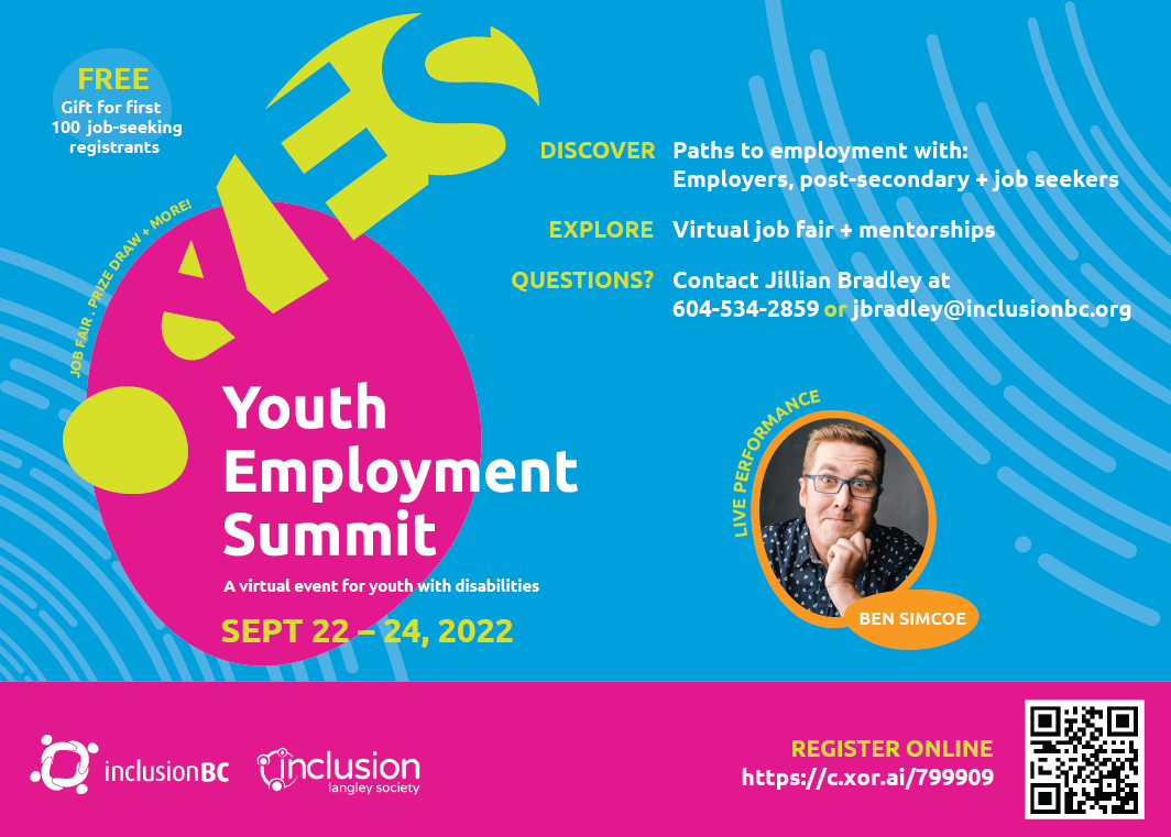 From September 22 – 24, 2022, Inclusion BC will co-host with Inclusion Langley a three-day virtual Youth Employment Summit (YES) to inspire, encourage, and support youth in discovering paths to employment.